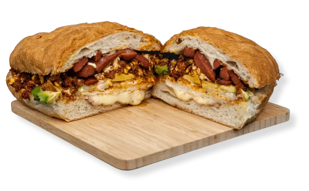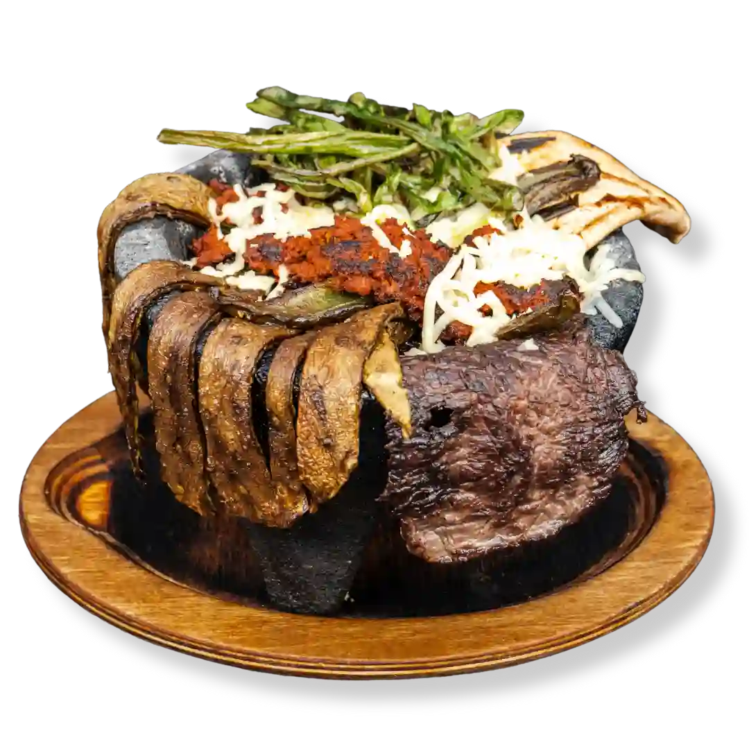 Steak, grilled chicken breast, chorizo (Mexican sausage), 7 jumbo shrimp, nopal (cactus), avocado, queso asadero and a house green salsa.