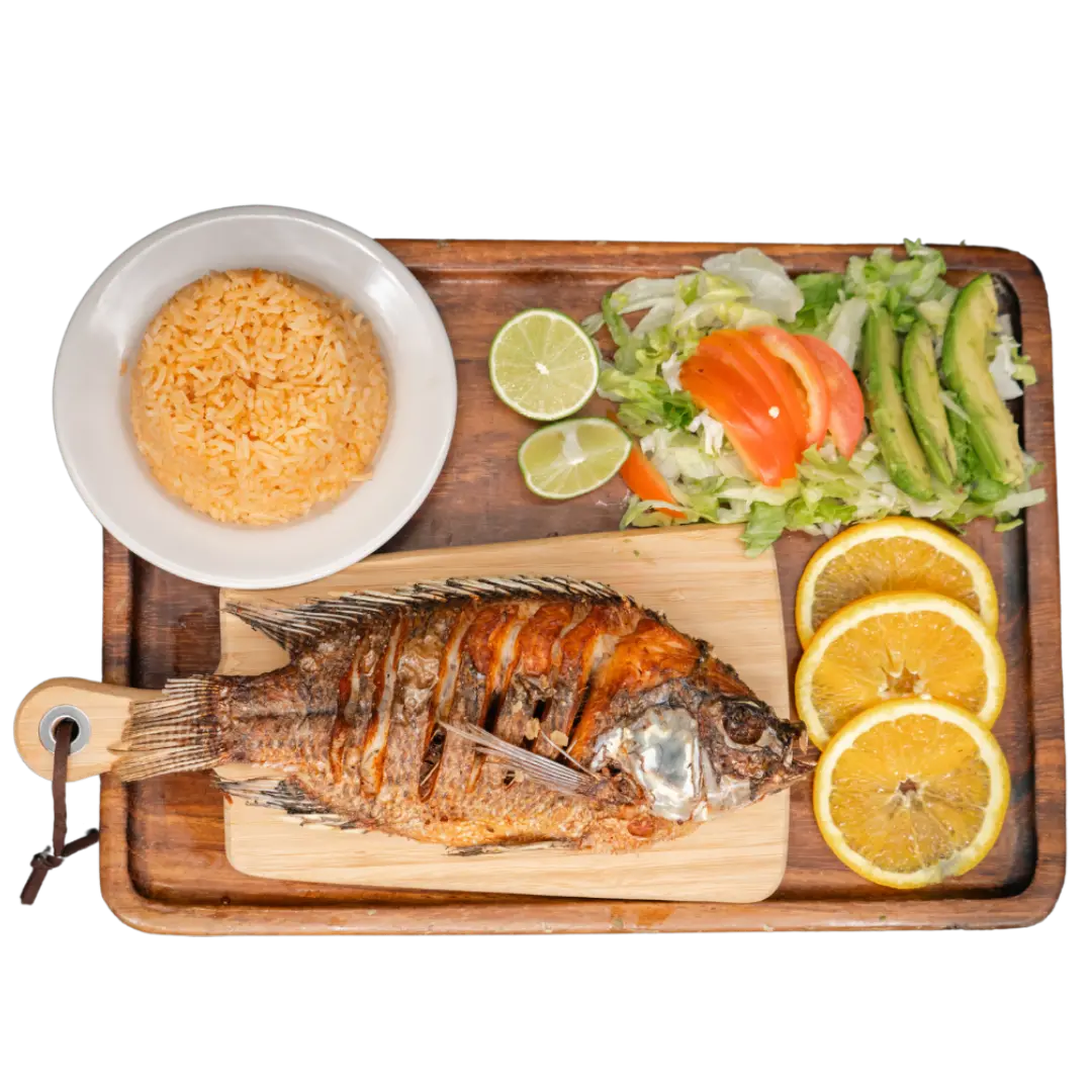 Deep-fried whole tilapia. Served with rice, lettuce, cucumber and avocado slices.